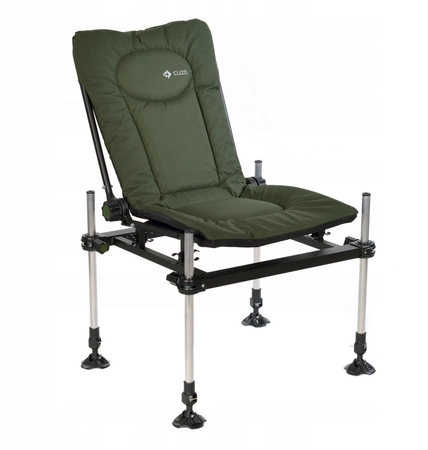 Fotel F3 CUZO daje możliwość zamontowania podnóżka – podestu, co zapewnia jeszcze większy komfort podczas długiego wędkowania. Dodatkowo, fotel wyposażony jest w poziomicę, co pozwala na dokładne wypoziomowanie siedziska, co jest szczególnie przydatne na nierównych powierzchniach.