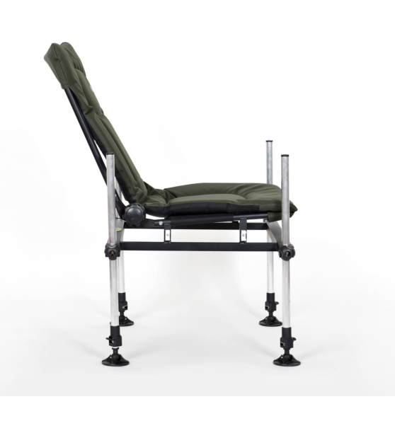 Fotel wyposażony jest w teleskopowe nogi o średnicy 25 mm, które można regulować indywidualnie, co pozwala na dostosowanie wysokości do trudnego i nierównego podłoża. Każda noga ma możliwość precyzyjnego ustawienia, dzięki czemu fotel pozostaje stabilny nawet na grząskim terenie. Dodatkowo, każda noga wyposażona jest w wstawkę z gwintem 3/8″x20, co umożliwia przykręcenie dodatkowych akcesoriów, takich jak podnóżek, stolik czy uchwyt na wędkę, zwiększając funkcjonalność fotela.