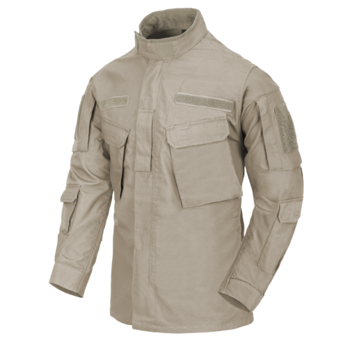 Kołnierz ze stójką podszyty polarem zapobiega otarciom podczas długotrwałego użytkowania z kamizelką i zawieszonym karabinem. Luźniejszy krój zapewnia pełną swobodę ruchów, a mankiety regulowane na rzep umożliwiają dopasowanie do indywidualnych potrzeb użytkownika.