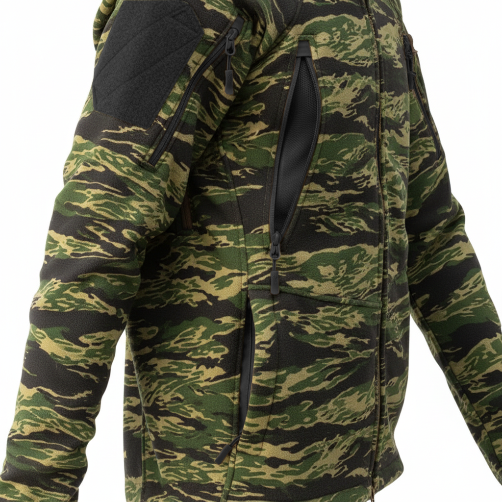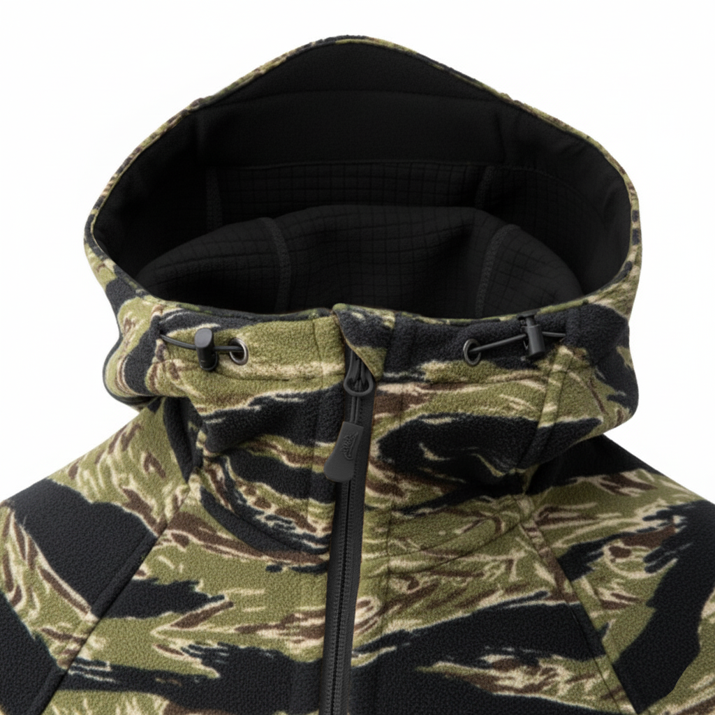Materiał Hybrid Fleece to połączenie dwóch warstw o różnych właściwościach. Zewnętrzna strona przypomina klasyczny polar, podczas gdy wnętrze wykorzystuje technologię grid fleece, znaną z bluz Alpha Hoodie i Alpha Tactical.