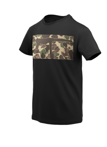 Kultowa koszulka militarna z kamuflażem Duck Hunter Klasyczny bawełniany T-shirt o standardowym kroju. Wzór karabinu i kamuflaż Duck Hunter przypominają o wojskowych korzeniach naszej firmy. Charakterystyczny kształt T-shirtów wyewoluował na początku XX w. z dawnej bielizny (tzw. union suit). Po II wojnie światowej bawełniane koszulki w kształcie litery T zrobiły się bardzo popularne za sprawą m. in. Marlona Brando i Jamesa Deana, którzy nosili je na ekranie.