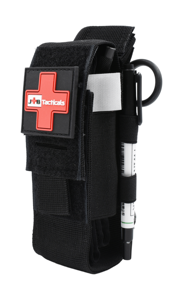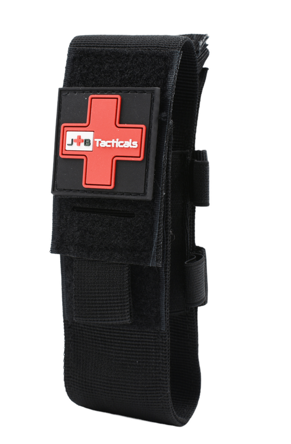 Ładownica na tourniquet / stazę taktyczną z miejscem na nożyczki taktyczne oraz uchwytami na marker w kolorze zielonym, czarnym i brązowym, z systemem MOLLE i elementami wycinanymi laserowo to produkt, który jest idealny dla osób, które potrzebują szybkiego i łatwego dostępu do swojego sprzętu taktycznego podczas działań na polu walki.