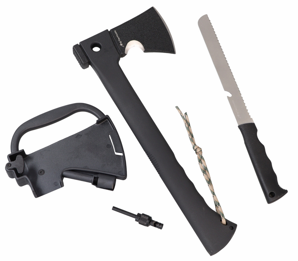 - Dodatki: krzesiwo z gwizdkiem, ukryty nóż z piłą i otwieraczem, młotek, przecinak do lin