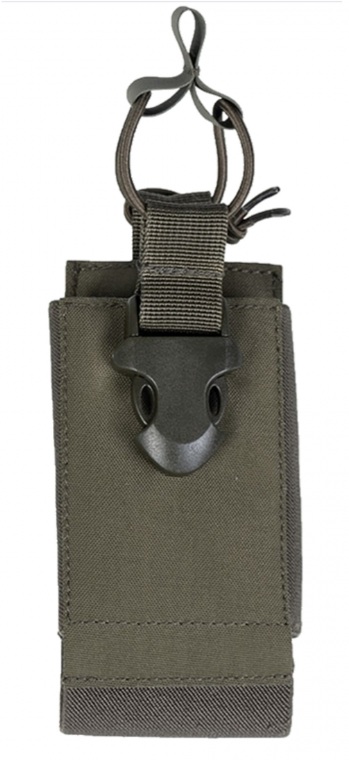 Radio można szybko i łatwo wyjąć za pomocą blokady klipsowej. Haczyki z tyłu umożliwiają przymocowanie kieszeni na radio do innego sprzętu za pomocą powierzchni Hook and Loop.