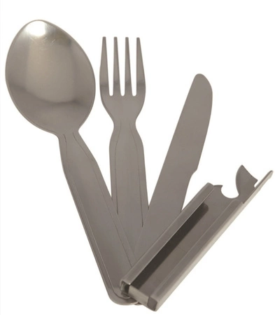 Zestaw zawiera podstawowe narzędzia niezbędne podczas wypraw na łono natury: nóż, widelec, łyżkę oraz otwieracz. Wykonany ze stali nierdzewnej, co zapewnia trwałość i odporność na warunki zewnętrzne.