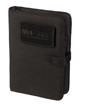 Wytrzymały notatnik taktyczny wyposażony w usztywnioną, wyściełaną okładkę wykonaną z poliestru powlekanego warstwą poliuretanu (PU). Z przodu znajduje się panel velcro (rzep) do mocowania naszywek, a na nim naszywka z logo Mil-Tec, którą można zdjąć.