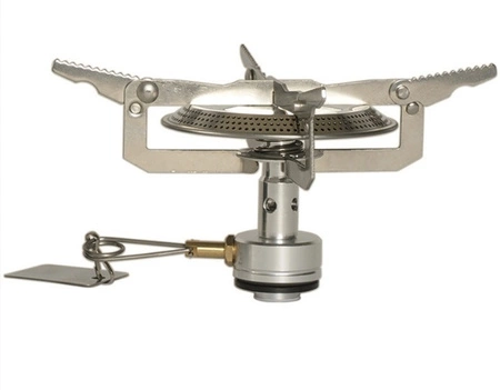 Palnik posiada składane ramiona z antypoślizgową strukturą, które gwarantują stabilne podparcie dla garnków i naczyń podczas gotowania. Dzięki kompaktowym wymiarom łatwo zmieści się w plecaku.
