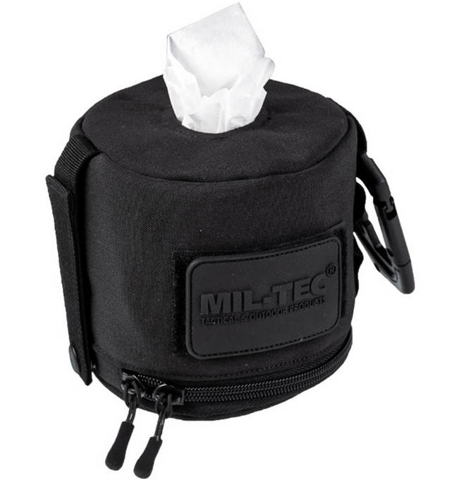 Chusteczki wyciąga się przez otwór na górze podajnika. Produkt można łatwo zamocować do plecaka, torby lub pasa dzięki kompatybilności z systemem MOLLE oraz dołączyć karabińczykiem do dowolnego elementu oporządzenia.