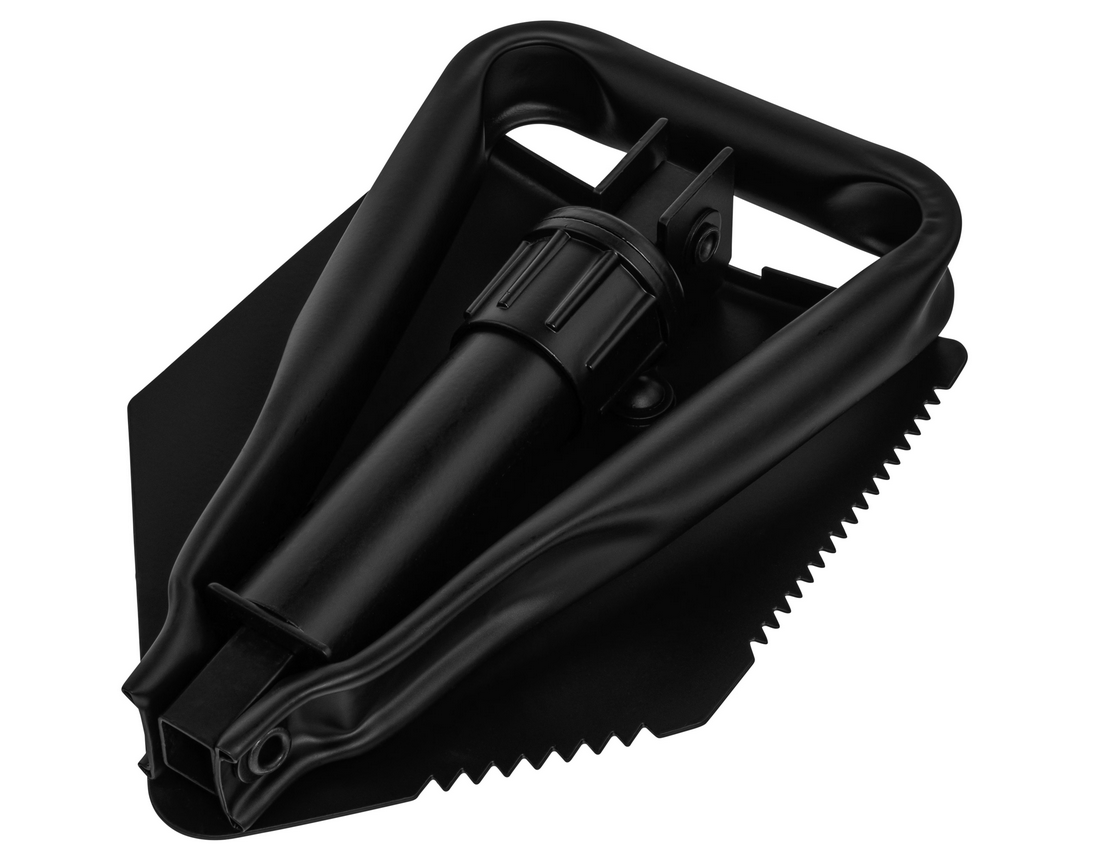 Praktyczna i solidna składana saperka wykonana z wytrzymałej stali węglowej, pokrytej czarną, matową farbą ochronną. Idealna na biwaki, wyprawy outdoorowe, survival oraz do prac w ogrodzie czy przydomowym terenie.