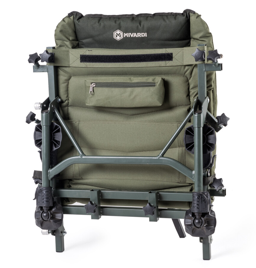 Nowoczesny i wszechstronny fotel z wysokim oparciem, zaprojektowany od podstaw przez markę Mivardi. Posiada innowacyjny system mocowań na akcesoria – aż 8 uchwytów rozmieszczonych wokół ramy, w których można zamontować opcjonalne adaptery (do dokupienia osobno). Pasują do nich wszystkie akcesoria wykorzystywane w fotelach typu match i feeder.