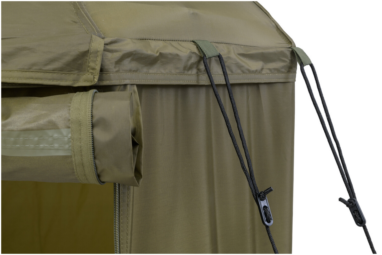 W pełni zabudowany, kwadratowy parasol o ogromnych rozmiarach. Bez problemu pomieści dwa duże łóżka wędkarskie. Jego konstrukcja oraz użyte materiały w pełni odpowiadają imponującym wymiarom.