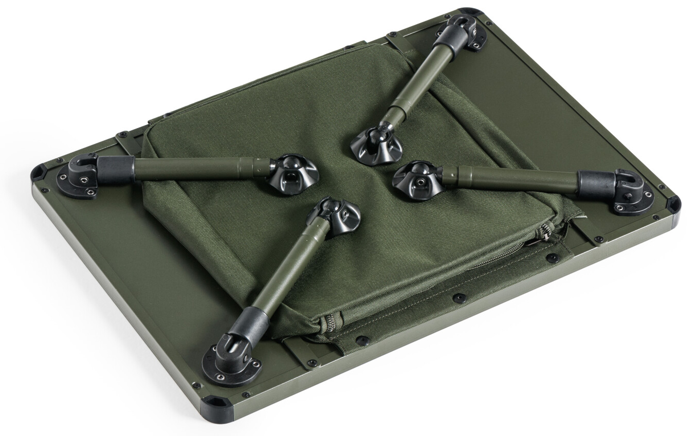 Nowo zaprojektowany, powiększony stolik biwakowy typu bivvy, idealny na zasiadki wędkarskie i biwaki. W pełni metalowa konstrukcja blatu gwarantuje wysoką sztywność i długą żywotność, nawet przy intensywnym użytkowaniu.