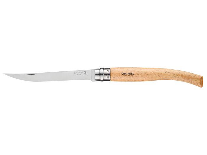 Składany nóż Opinel 12 z nowej serii Slim. Ergonomiczna rękojeść ma nowy kształt i jest wykonana z lakierowanego drewna bukowego. Elastyczna głownia wykonana jest z nierdzewnej i modyfikowanej stali Sandvik 12C27. Jej ostrze zapewnia bardzo dobre właściwości tnące. Kształt głowni został zmodyfikowany.