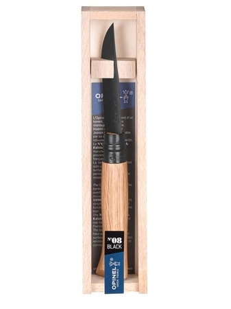 Tradycyjny składany nóż Opinel. Ergonomiczna rękojeść wykonana jest z lakierowanego drewna dębowego. Głownia (dł. 8,5 cm) wykonana jest z nierdzewnej i modyfikowanej stali Sandvik 12C27. Jej ostrze zapewnia bardzo dobre właściwości tnące. Nóż wyposażony jest w system blokady Virobloc- blokuje on głownię w stanie otwartym lub zamkniętym. Głownia i pierścień są pokryte specjalną powłoką w czarnym kolorze. Nakładana jest ona metodą elektrolityczną, która zwiększa odporność na korozję.